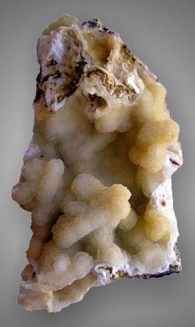 Aragonitové steblá obalené lupeňmi kalcitu. Tento nález pochádza z lomu pri Žarnovici, z roku 2006. Pri lámaní andezitu pre priľahlú autostrádu v ňom boli nájdené pukliny vyplnené takouto krásou. V súčasnosti je to už odťažené.